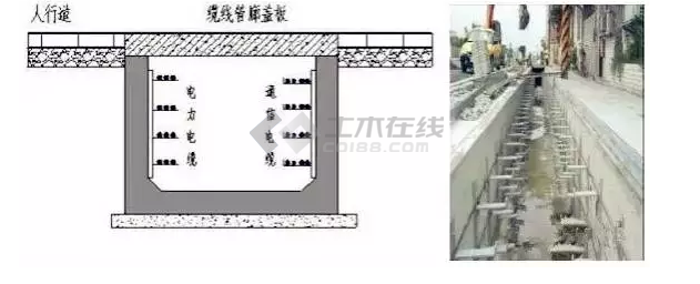 主要負責將市區架空的電力、通訊、有線電視、道路照明等電纜收容至埋地的管道。一般設置在道路的人行道下面,其埋深較淺,一般在1.5米左右。以矩形斷面較為常見,一般不要求設置工作通道及照明、通風等設備,僅增設供維修時用的工作手孔即可。