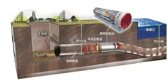 使用盾構在地中推進,通過盾構外殼和管片支撐四周圍巖,防止發生隧道內的坍塌,同時在開挖面前方用刀盤進行土體開挖,通過出土機械運出洞外,靠推進油缸在后部加壓頂進,并拼裝預制混凝土管片,形成隧道結構的一種機械化施工方法。